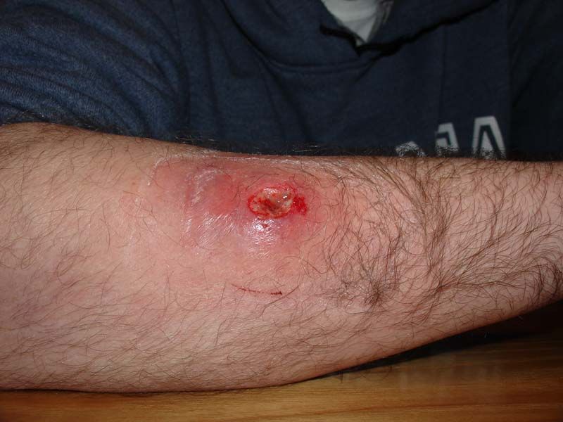 At first I thought the little bump was a pimple or something similar so I didn't pay any attention to it. After 2 days the wound had grown to about the size of a small marble, red 'lines' appeared running up towards my elbow and a hole opened-up in my arm. Not cool.