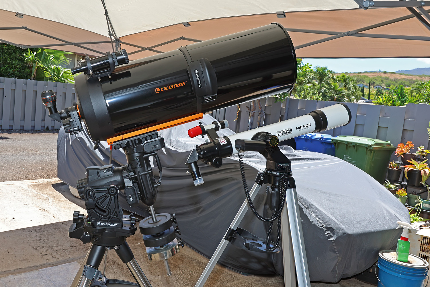 I needed a lens with more reach so I picked up that 11" black beauty by Celestron. It's configured for initial alignment and will be set up for astrophotography this evening with the filter wheel, guide camera, imaging camera and power/data transfer cables added into the imaging train. The baby scope in the foreground was given to me in neglected condition so I did a repair/refurb job on it that exceeded the original 1980's price paid for it but it's fully operational to as new condition and I'm gunna gift it to any niece and nephew who'd like to dive into the hobby or give it to one of the local schools who might have an astronomy club or any interested student that like to own it.