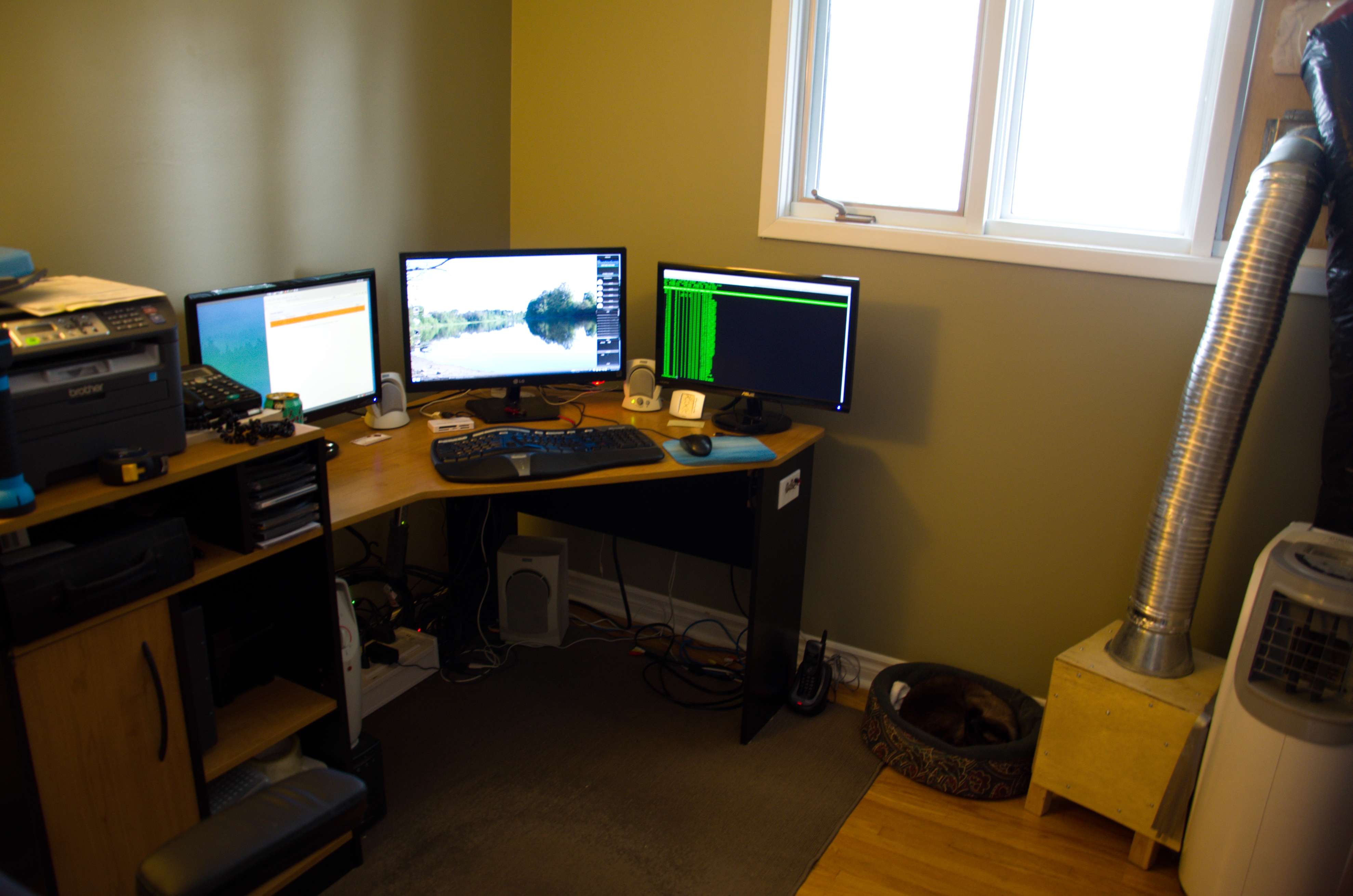 This is my current setup, but I eventually want to build a bigger desk and put those monitors on an arm. I'd make the desk span the whole wall on the left, instead of being a corner desk. Or maybe even make it a L desk and have a smaller section spanning the other wall, for extra room for working on stuff. I want to get more deep into electronics but don't have much of a work bench for it.