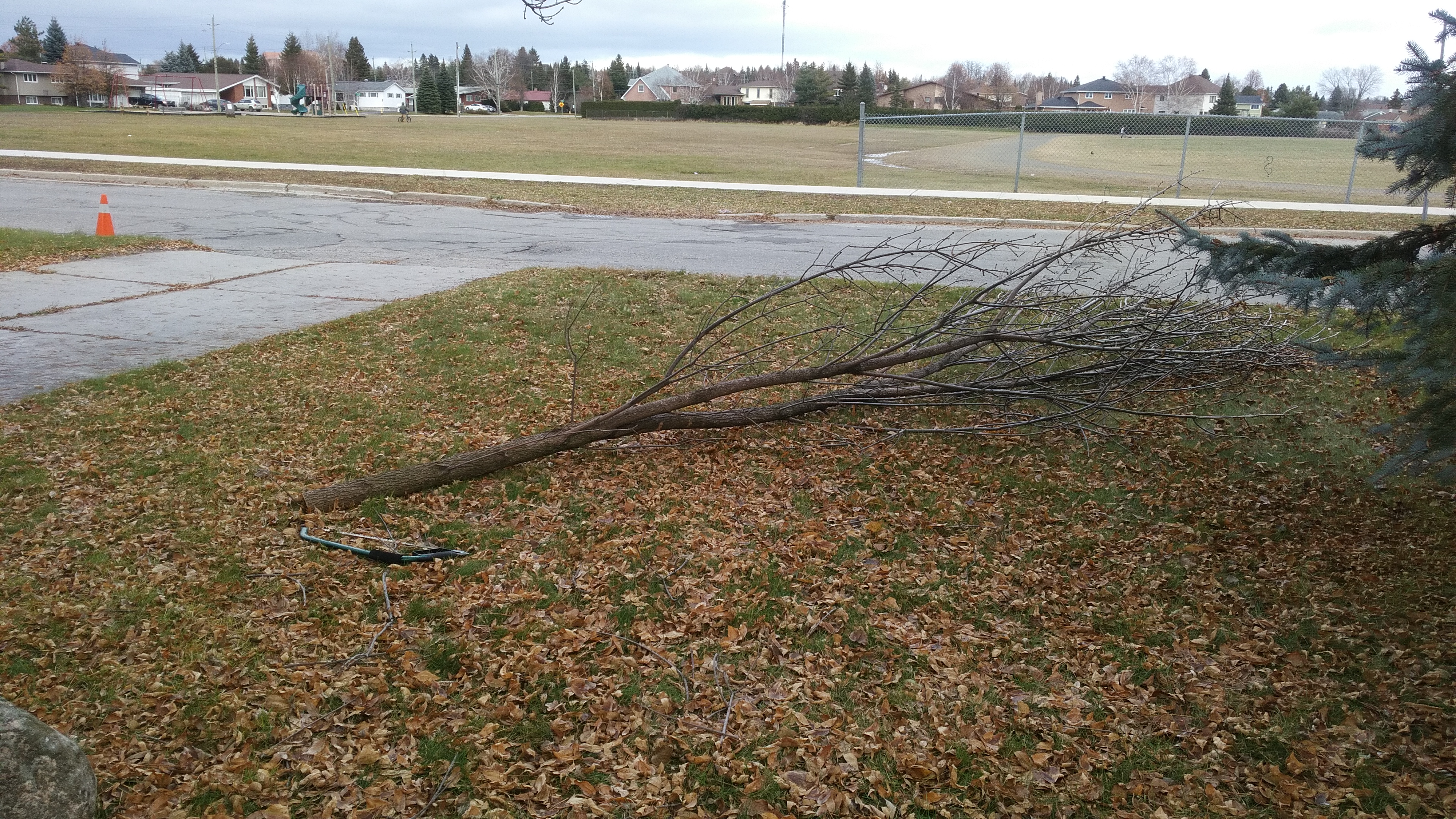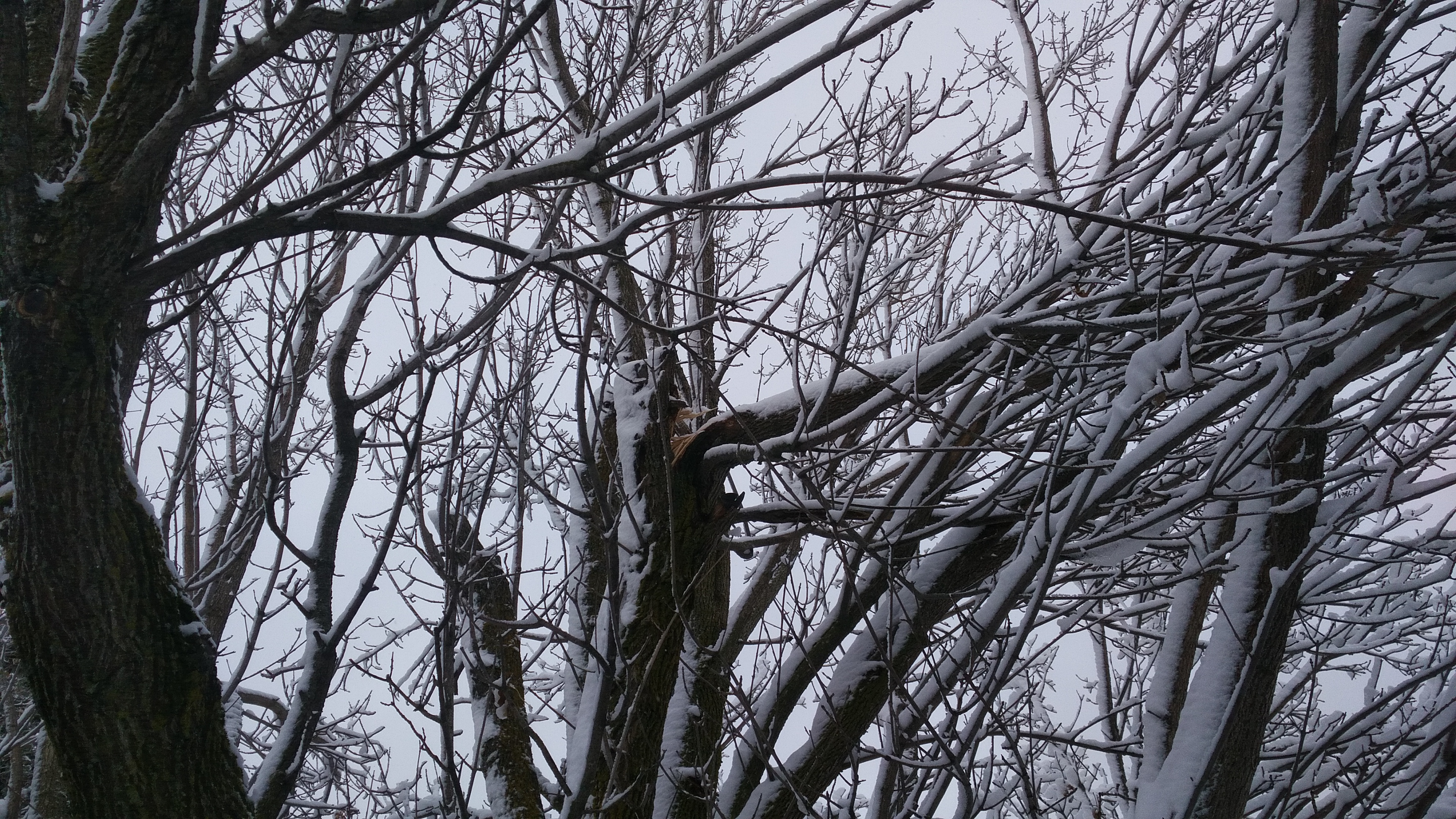 I have one about that size, but it's mixed in with utility lines. I meant to get it last year, but didn't get to it. I'm a little uncertain how to approach it. Thinking about making a pole saw to take it off near the wires, then I can get the rest of the branch. That way there'll be less chance of doing something bad to the wires. I puzzle over it a bit, think "I'll get it later", and here I am... I need to do something cause the branch is split, and I don't want disease setting in.