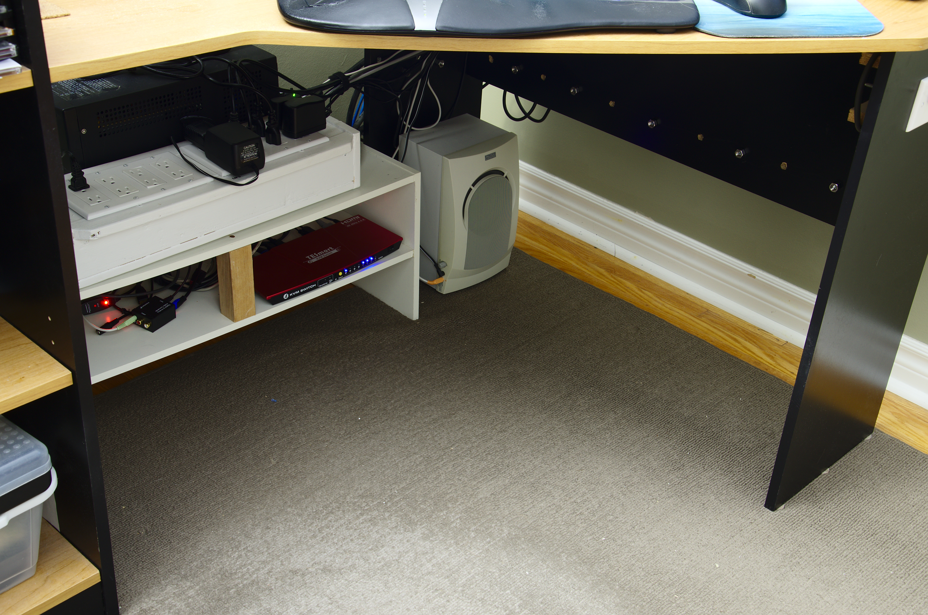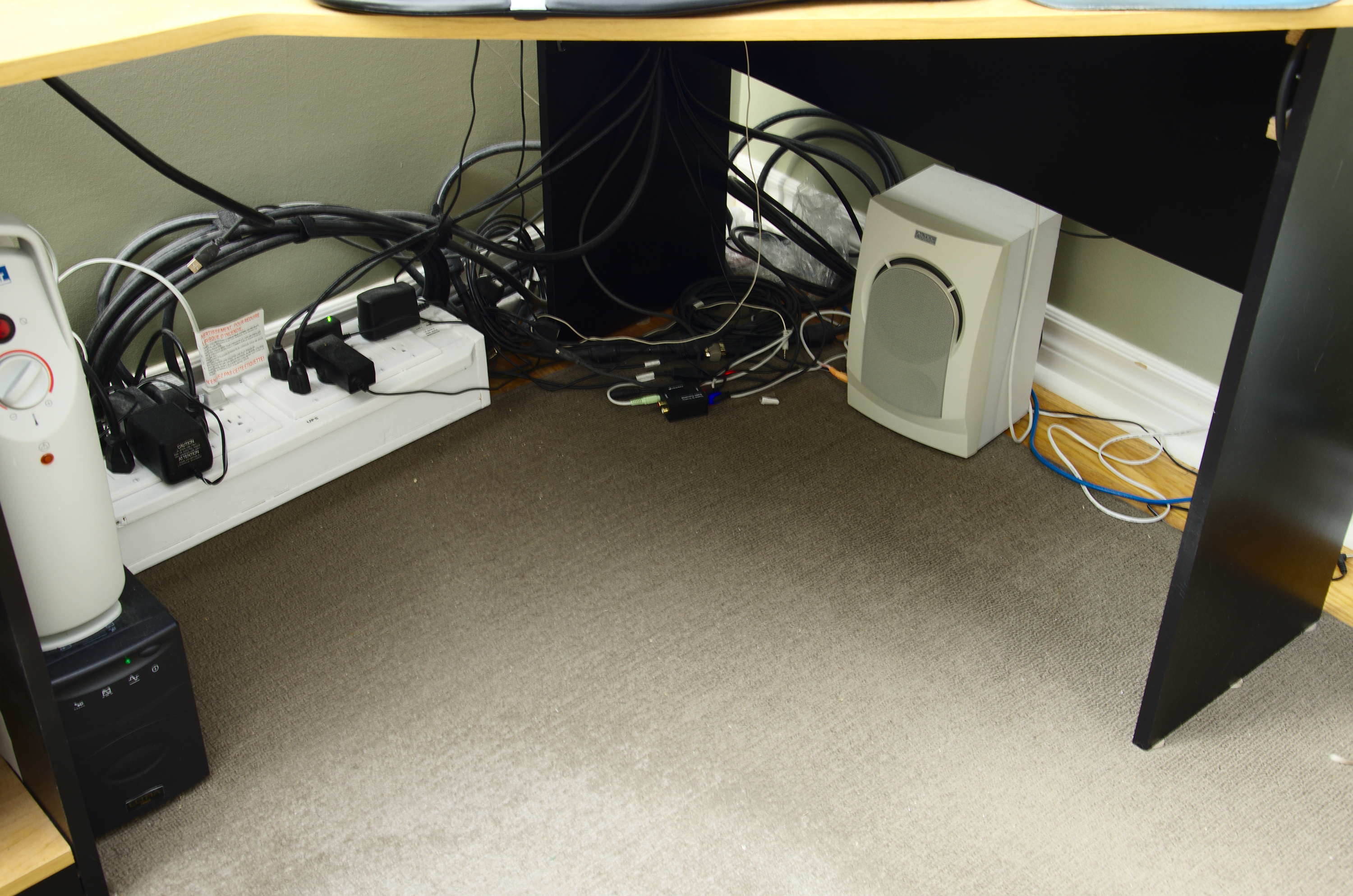 Cabling is not super good, but my main goal was to take it off the ground and remove unused cables such as the 5x 25 footer DVI ones, which were super bulky. I don't want any cables touching the ground. Makes it easier to vacuum, and if I drop something it's actually obtainable instead of vanishing into the nether.