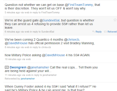 UPDATE: As they have done several times before, Jane Hamsher today drove David House to visit Bradley Manning at the Quantico brig -- this time, as they announced ahead of time, House intended to deliver to brig officials a petition relating to Manning's detention conditions which has been signed by 42,000 people (only House is on the approved visitors list, so Hamsher typically drops him off, waits at a base McDonald's nearby (as she's been instructed to do), and then picks House up once his visit is done). Today, they went to the brig and House attempted to enter, the same way as always, but, as of 1:45 2:15 pm EST, both of them have been detained for 45 minutes 1 hour and 20 minutes, and told that they are not permitted to leave or else they will be arrested. They have now been told -- without explanation -- that they are not permitted to enter, and Hamsher's car is being towed off the brig's property and impounded. Here is House's live Twitter feed sent during this episode (start at the bottom and read up):