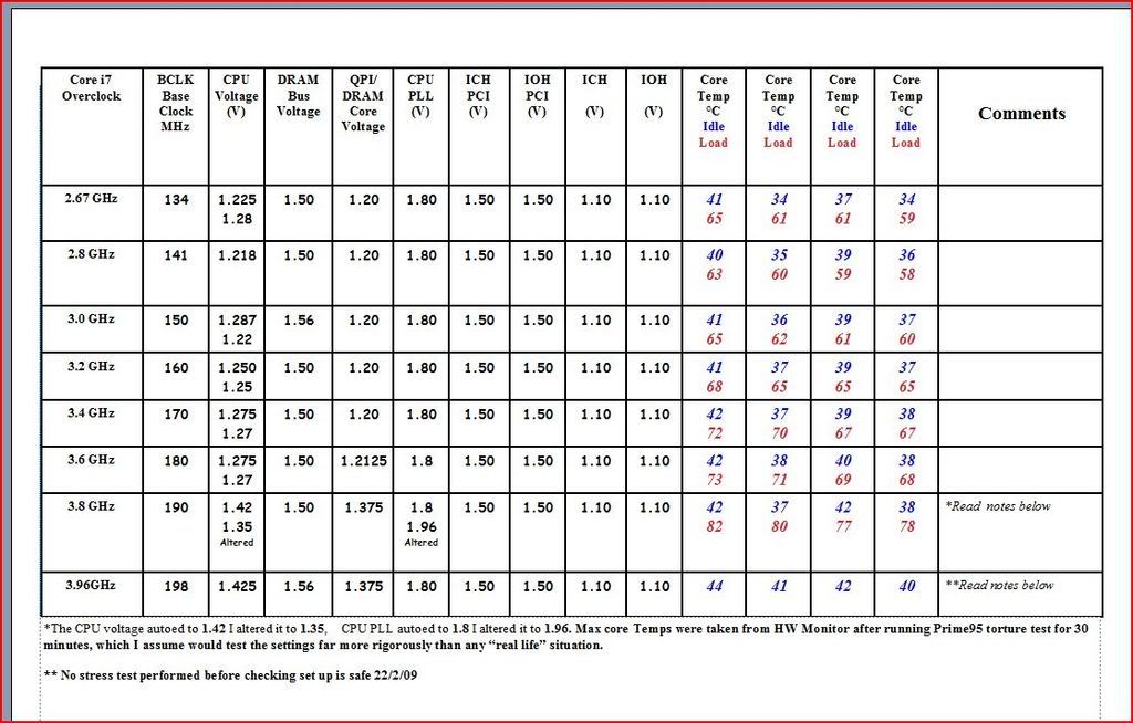 The link below shows the settings and readings for various stages of overclocking my Core i7 920. I am happy with all the overclocks except for the 3.96GHz as I feel the auto chosen CPU voltage could be harmful to the CPU, hence I took the readings but did not do a stress test. I lowered the voltage but got a blue screen after Windows load up screen. I would like some opinions regarding the CPU voltage and any other settings that could be cause for concern.