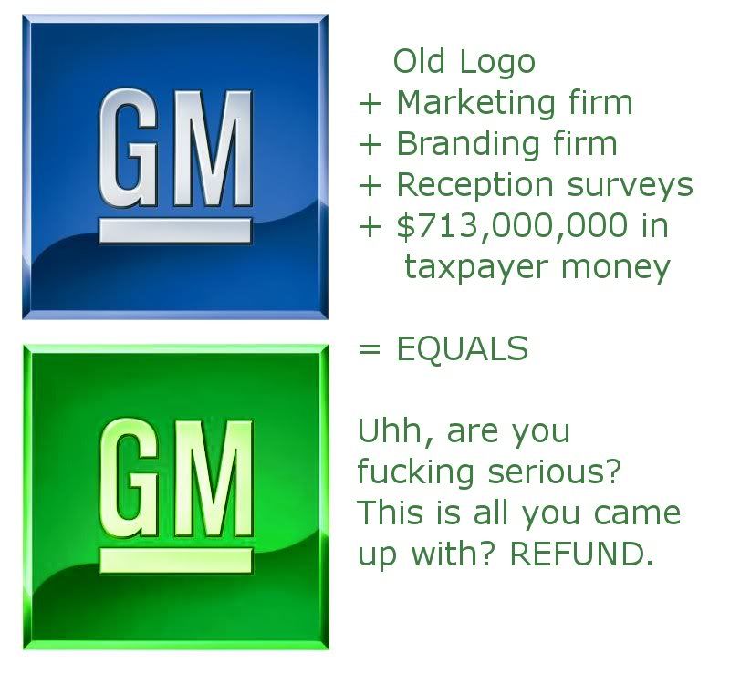 "Government Motors"... "Obama Motors".. "Green is for dumb people".. It's odd to find such a reactionary and right swaying online forum, I guess nerds were tired of being picked on in high school so they became hostile, un-empathetic, selfish bores... "Obama keep your hands off of my wallet!" Do you think that a republican in power would lead to a massive surplus, where we'd all get huge refunds and the government would just leave all of us alone? Nah, that wouldn't happen kiddos.. And we'd also go back to banning stem cell research because God wants to save the innocent babies! I for one welcome scientific research in various fields and think investing in our future is fine.
