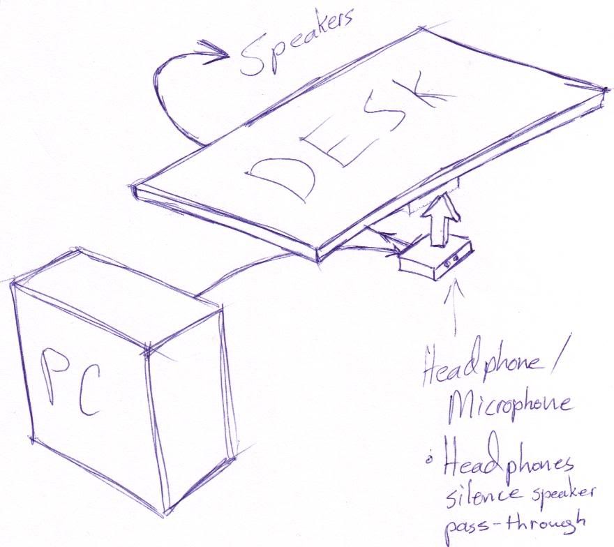 It has to mount under the ledge on my desk in front of the keyboard tray. It also must have a pass-through for speakers and must silence the speakers when headphones are in use.