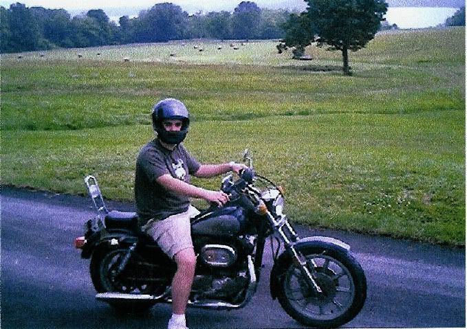 It was my father's dream to own a Harley-Davidson. After years of saving, he finally got a new Roadster in 1983. He rode when he was healthy, but died from complications of lung cancer and leukemia in 1989; I was three years old. The bike sat in various barns for about 15 years, and when I was 16 years old, my mother let me take it out and try to get it going. Here's a pic of me riding it for the very first time..scared shitless and trying as hard as I can to keep the damn thing running on one cylinder:
