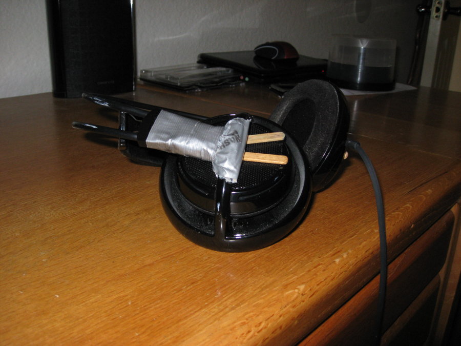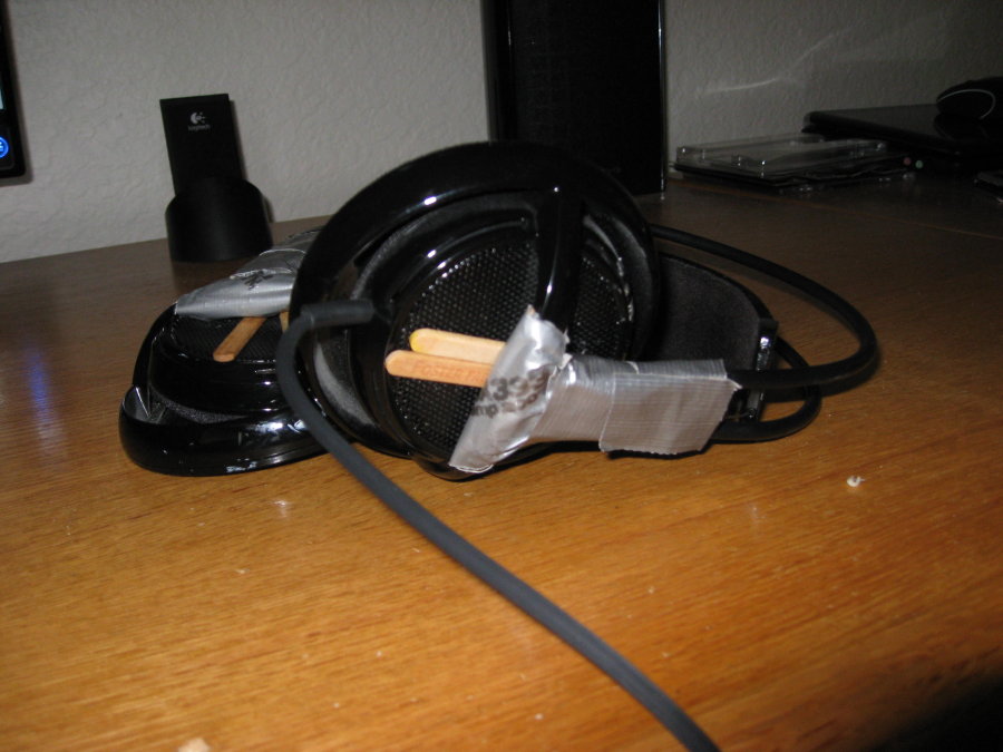 but i'm unwilling to let it go just yet. i've resurrected it from death so many times. the sound has gone out on both earcups before, but some speaker wire and solder, and it's back in business. the earcups have broken past their locks, so i've duct taped them back in place with popsicle sticks as braces. at the moment, the ear pads are so smashed down that it's painful to wear it. but i still dont want to replace it.