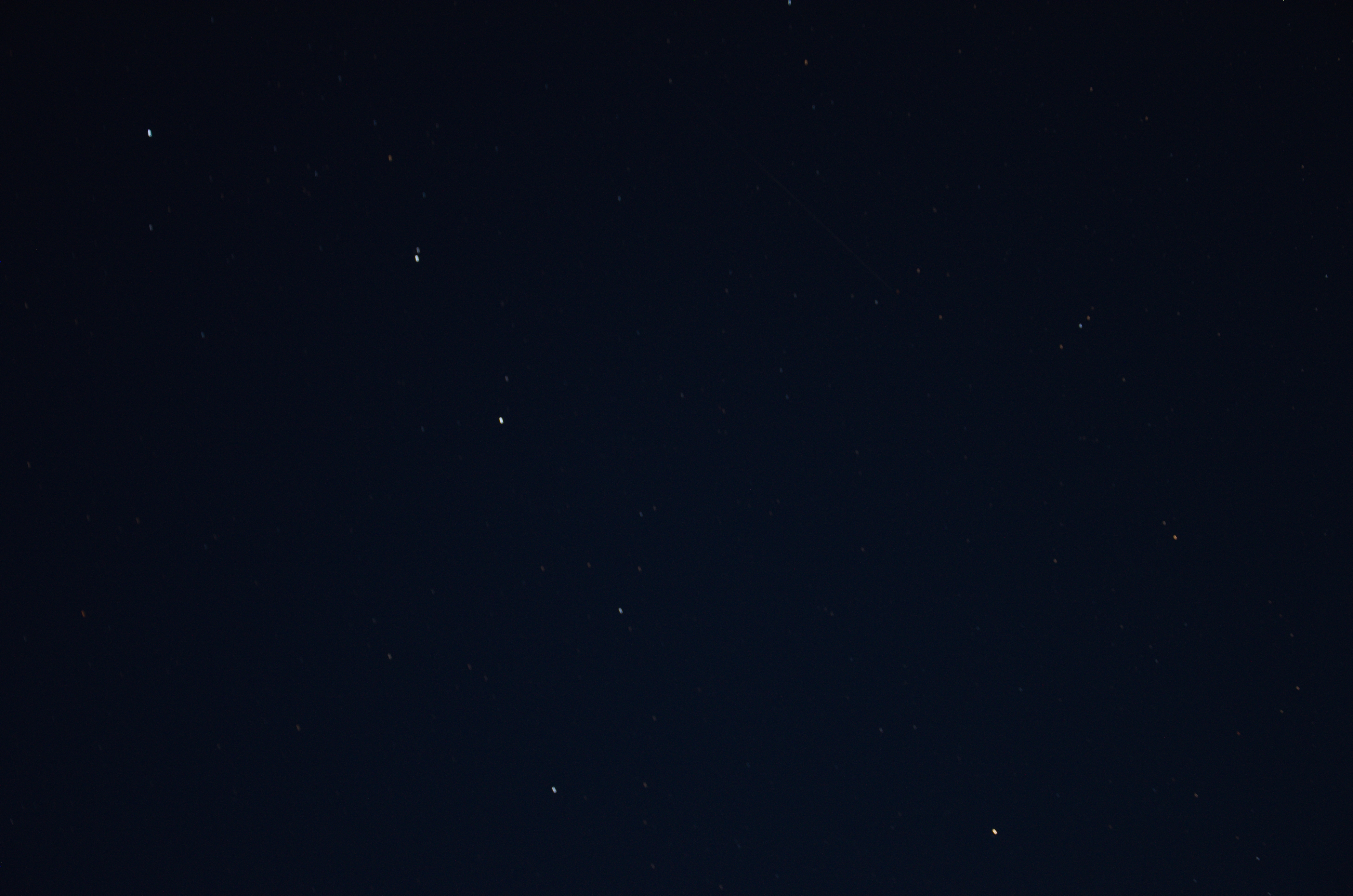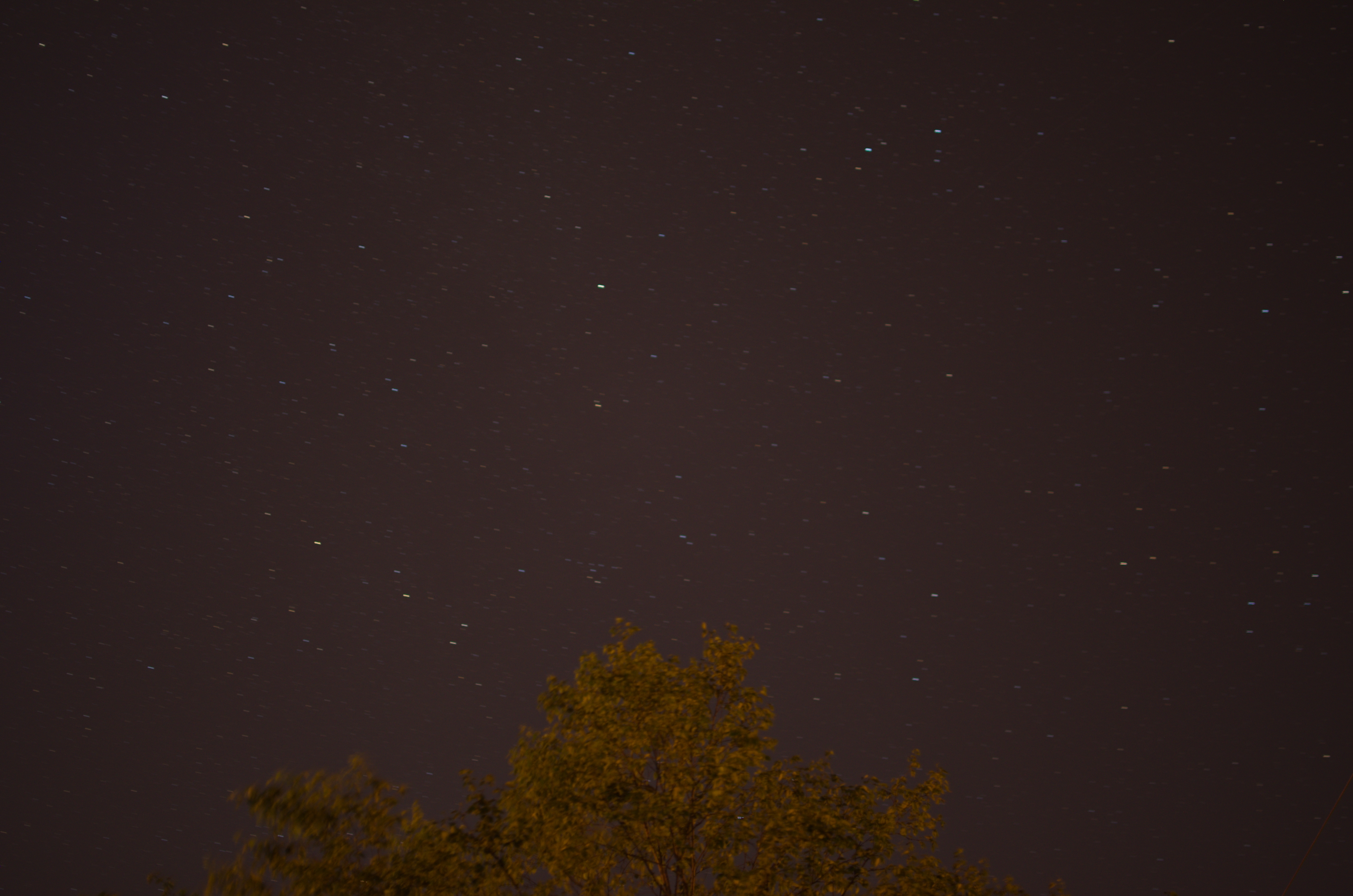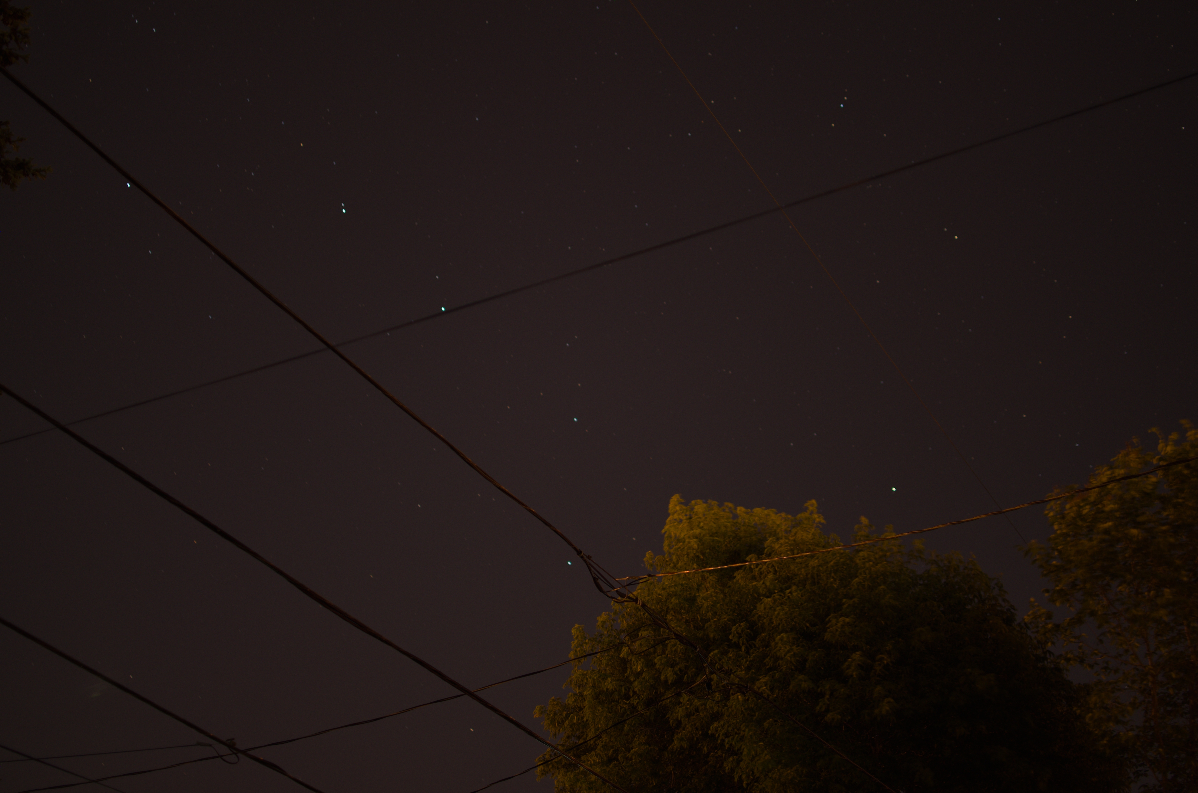 I think I read somewhere the idea of putting a small sandbag on top of the camera. Do you hang a weight from the bottom of the tripod? And, no moon yet out back; I should check out front. Not a great night here for stars; a bit of a haze blocks the light from many.