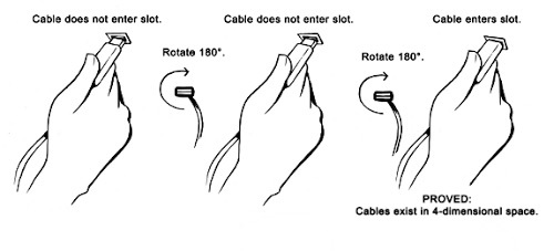 Thing is, since it's just a 50% chance of getting it right, you tend to not try hard enough on the first try. So you give up and rotate it 180 degrees and then you realize it's definitely the wrong way now. Feeling stupid and angry, but also confident, you rotate it 180 degrees again and shove it in with more force and authority, so this time it works.