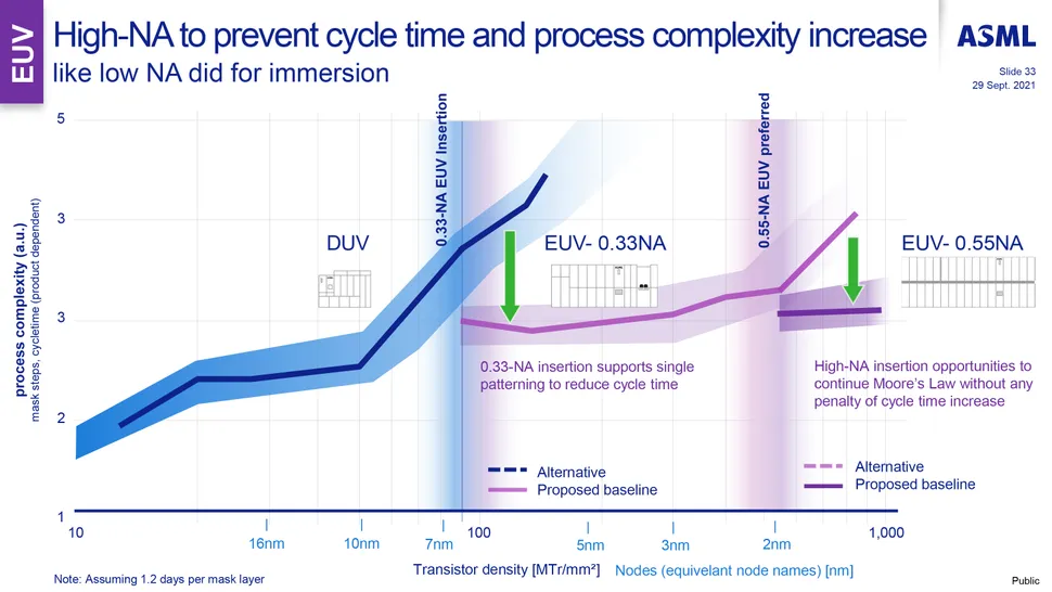 According to ASML, high-NA is less complex starting at about 2 nm node scale. That doesn't mean that standard EUV won't work though. It comes down to a tradeoff: price of the high-NA EUV equipment vs higher complexity of standard EUV equipment.