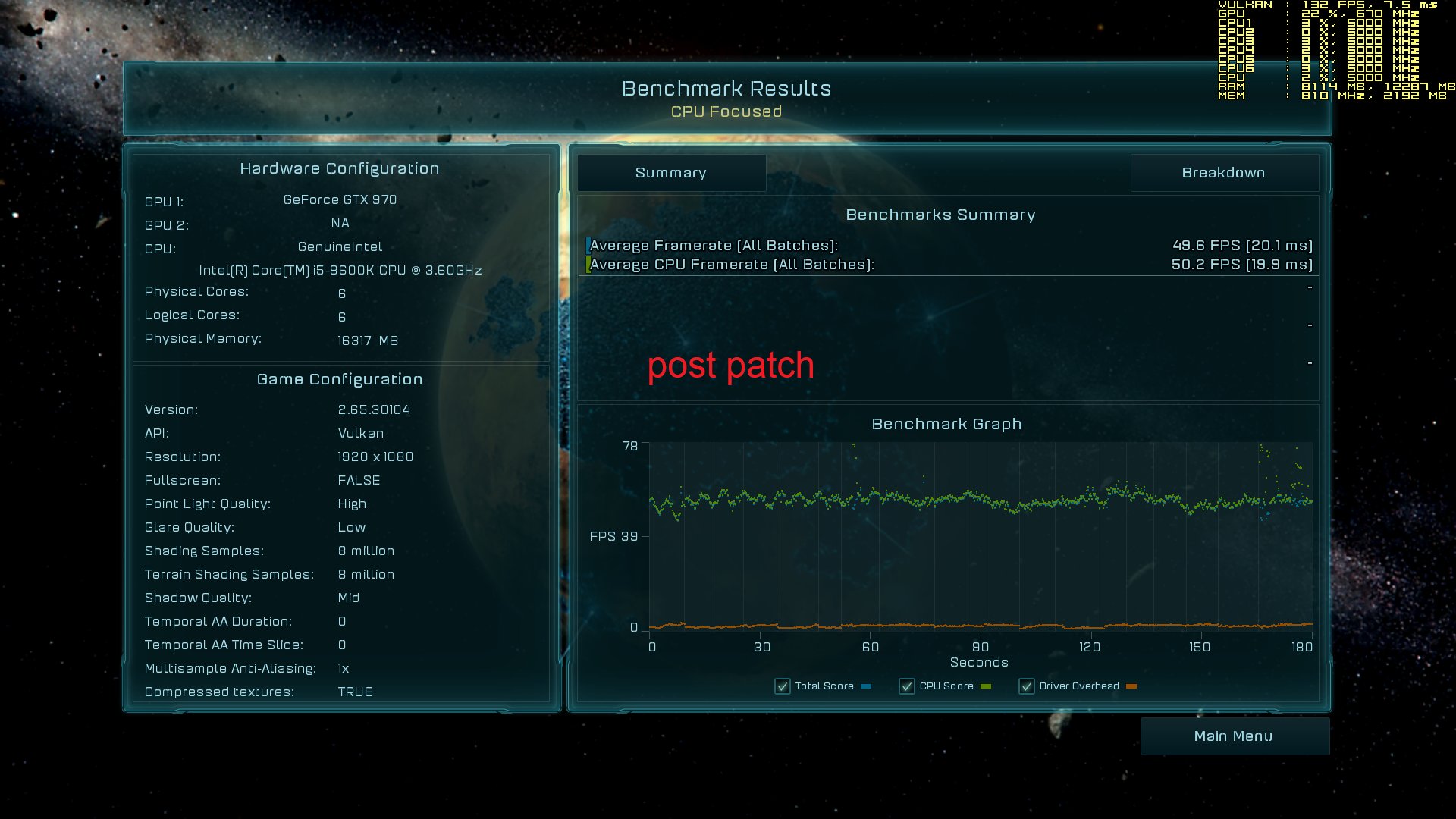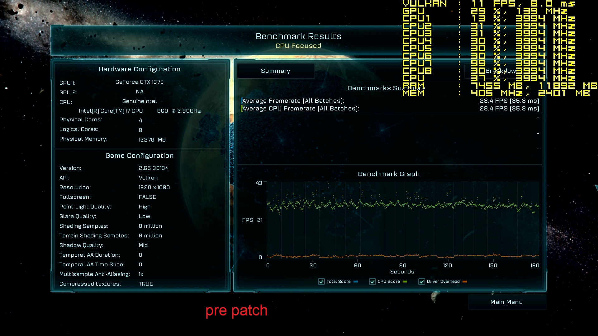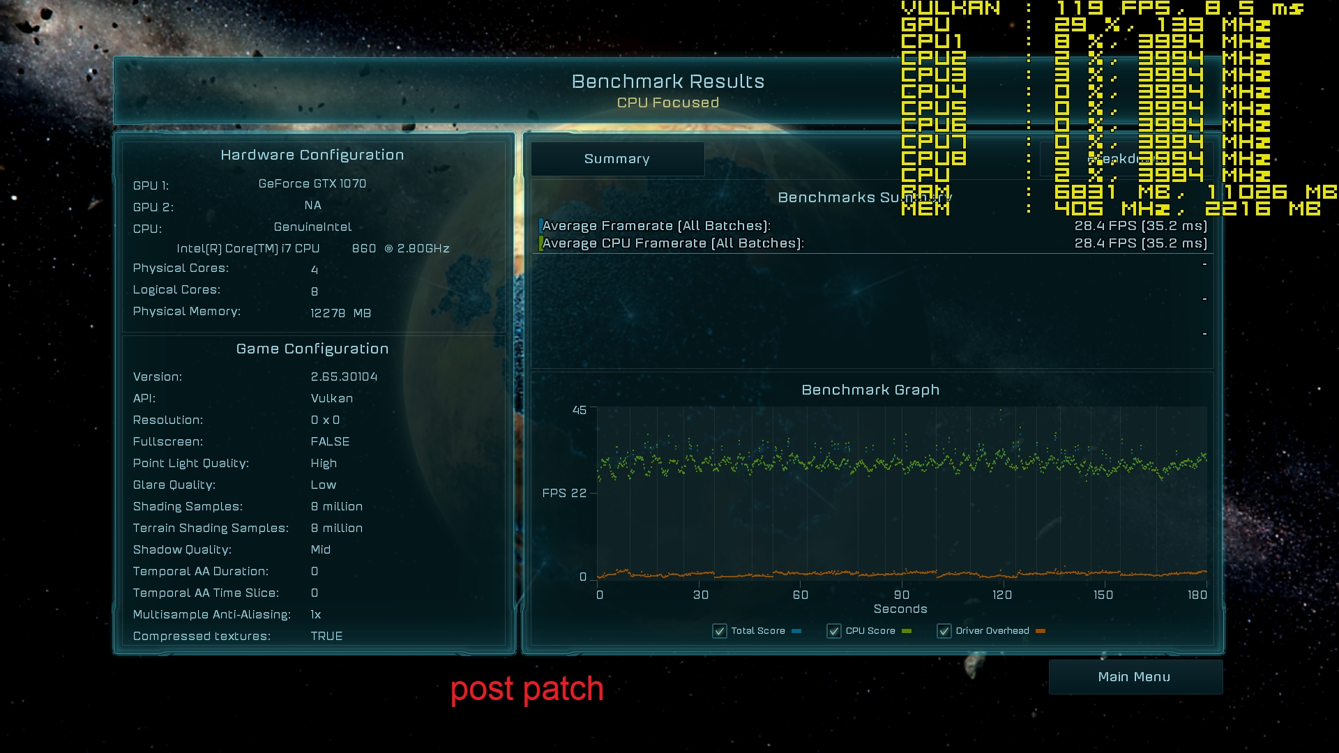 And of course we cannot defy the king of cpu limits, Ashes of the Singularity, which for the Vulkan test being the best for both systems, gave us post patch, an average cpu framerate of 152fps for the 8600k and 74fps for the i7-860.