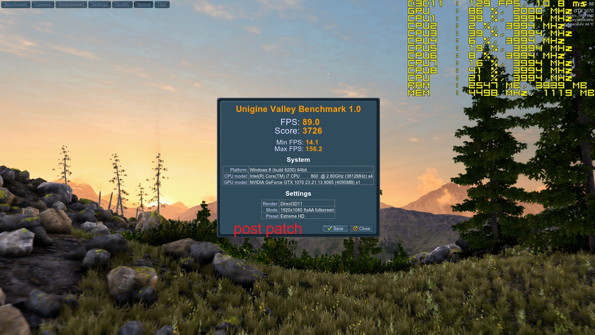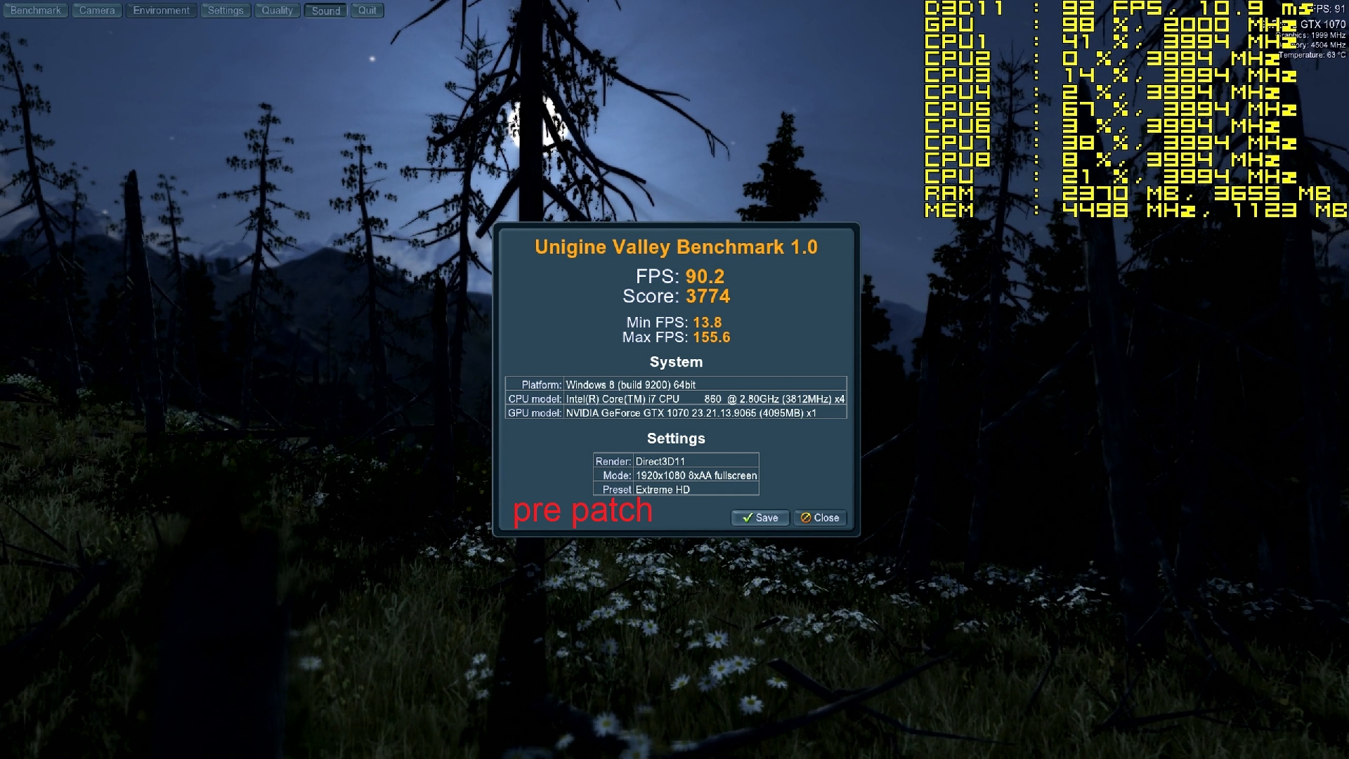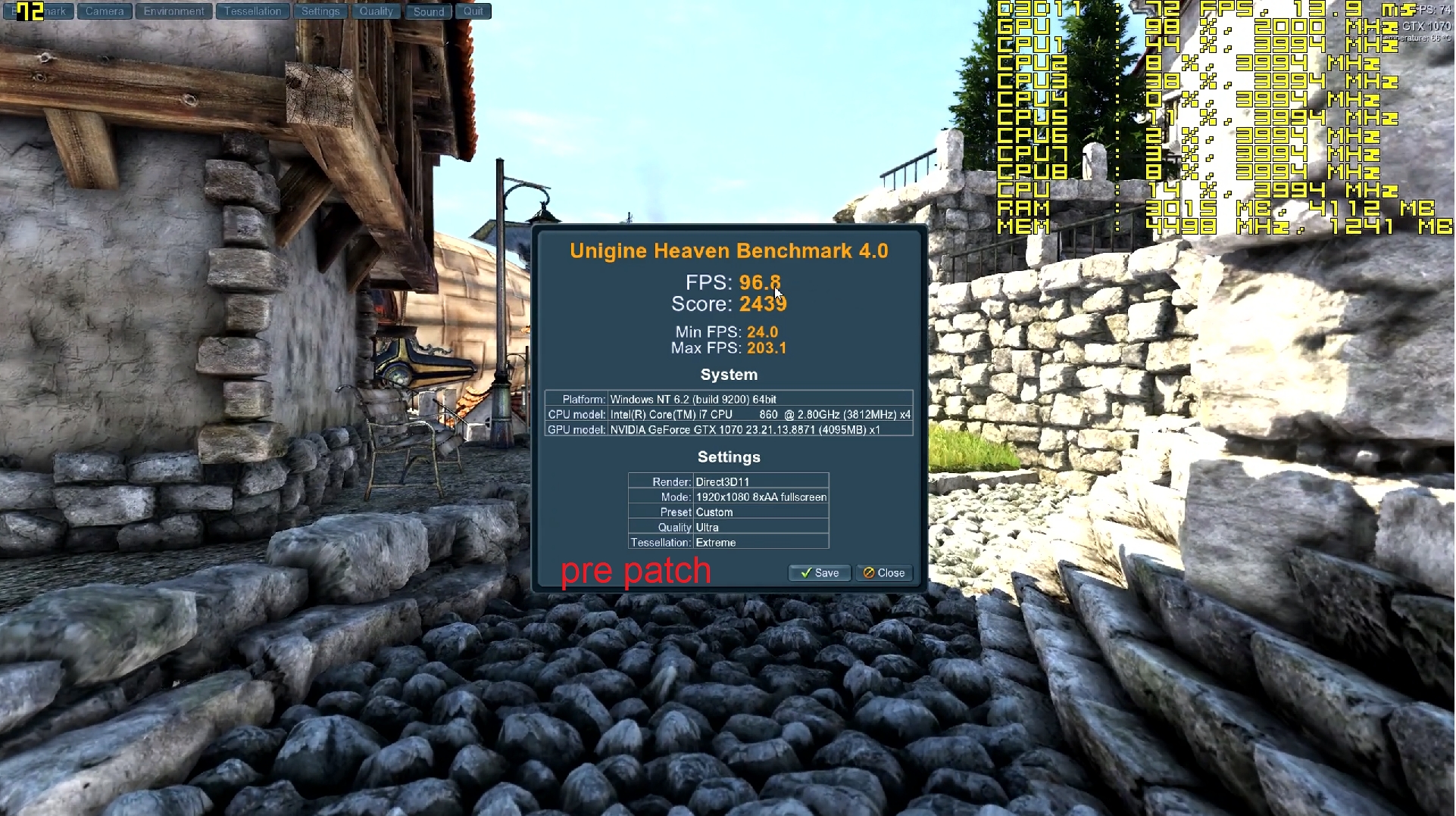 Please note that ALL post patch benchmarks, were with the 390.65 driver for both the 1070+860 and 970+8600k configurations. This driver is not only the latest available, but also brings security updates regarding the recent vulnerabilities.