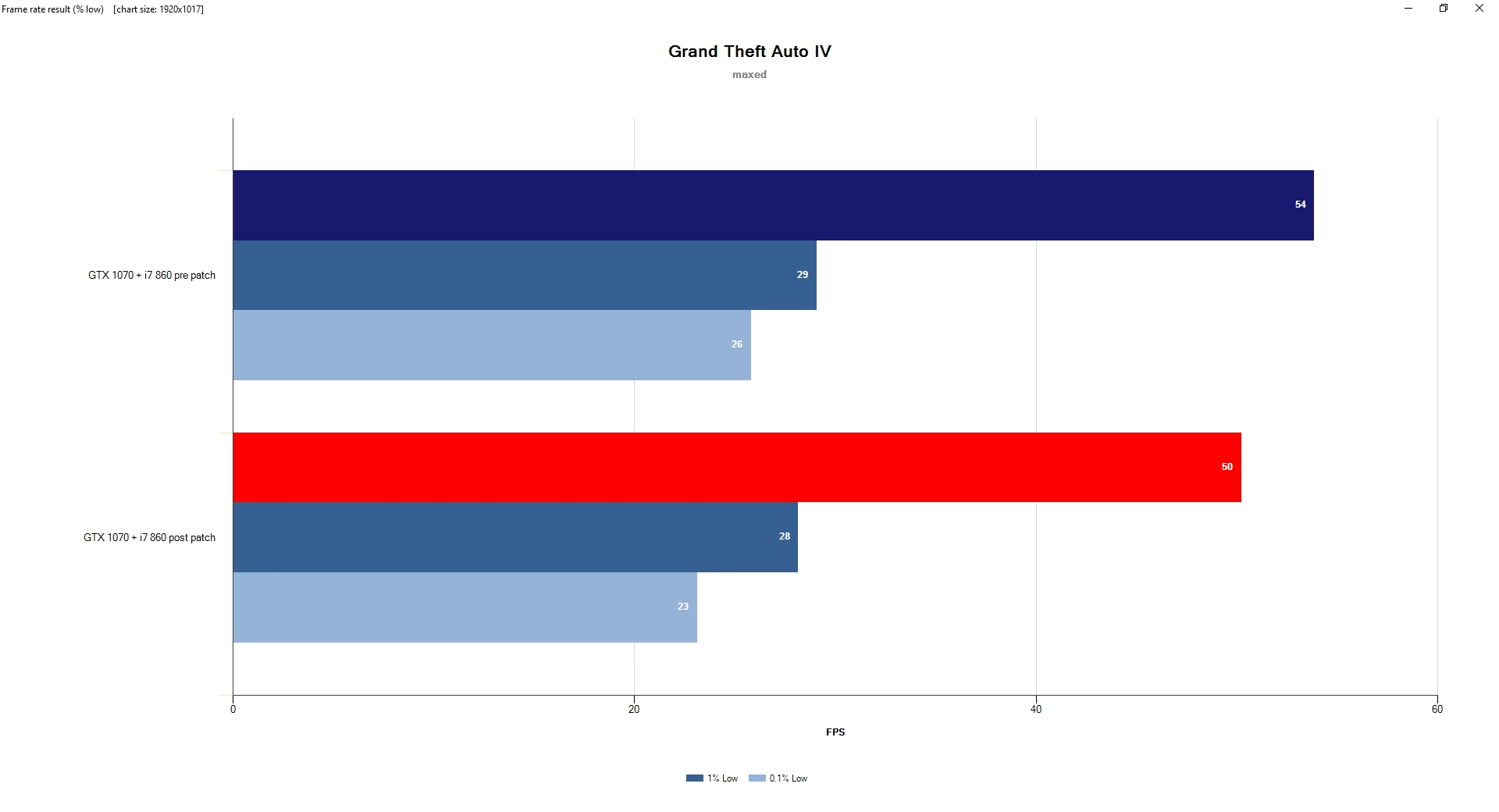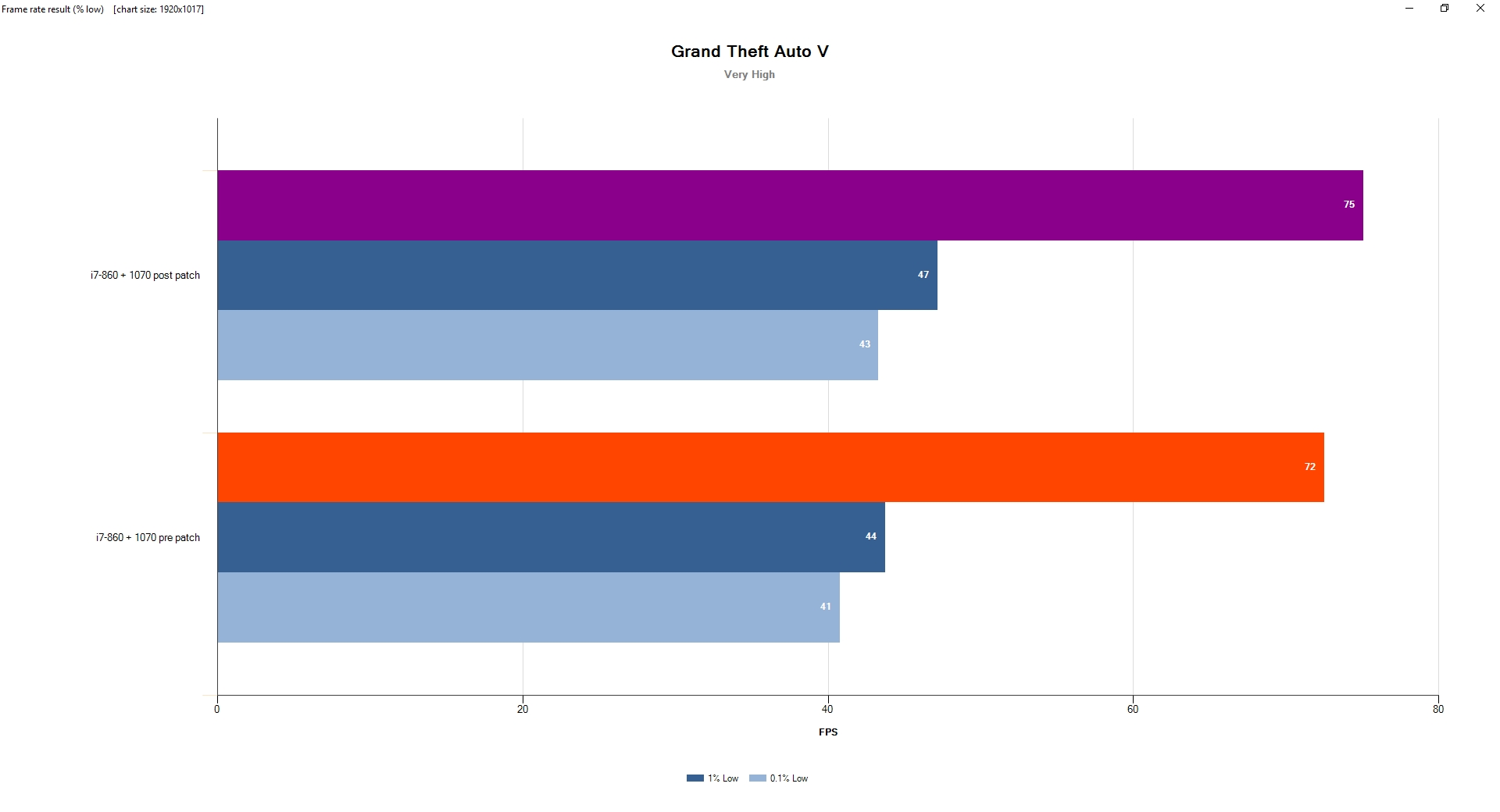 Let’s do a comparison on the above numbers. Take GTA V for example on the i7-860+1070. You will see that it has the same benchmarking result of 75fps average, as the 8600k with the much slower 970. However its 0.1% and 1% lows are quite better. You can feel it while playing. This is a direct result of how cpu limited this game is. For reference, the 1070 with the 8600k gave me 115fps average, but this is a discussion for another time.