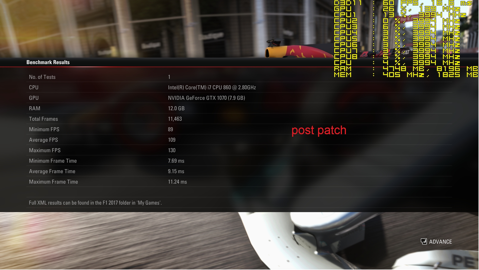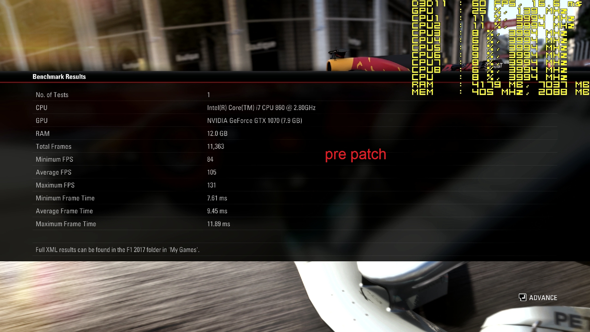 F1 2017 1920X1080 ultra + high GTX 1070 @2Ghz CORE i7-860 @4GHz