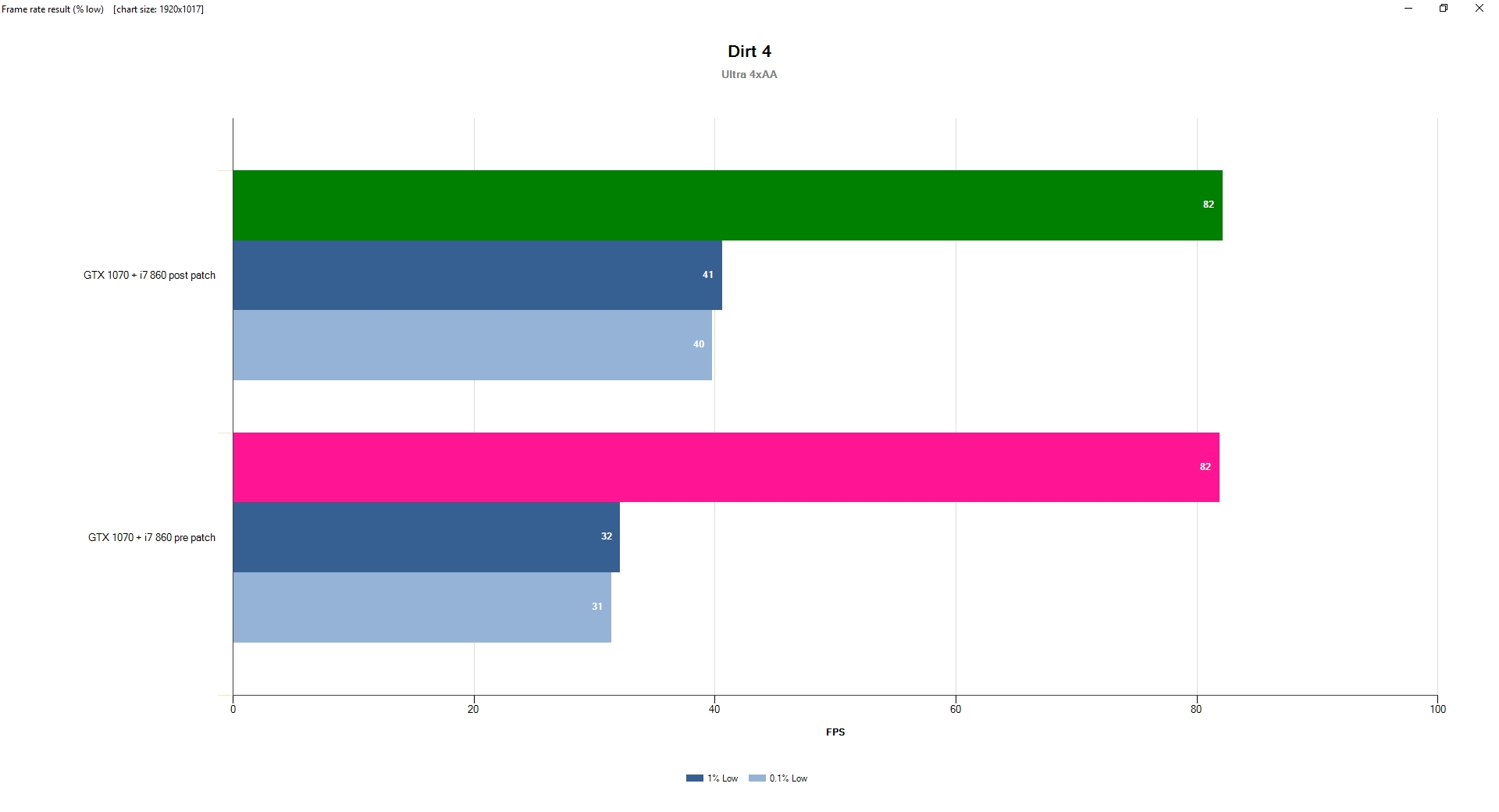 The better 0.1% and 1% lows you see on Dirt 4, I have to admit that have been affected by the newer driver. This is the exception to the rule however and not the other way around. There is a specific part at the beginning of the run, which makes the framerate to dip. It dips on the newer driver also, but a little less. The overall average framerate was not affected as you can see however and I felt the game running exactly the same.