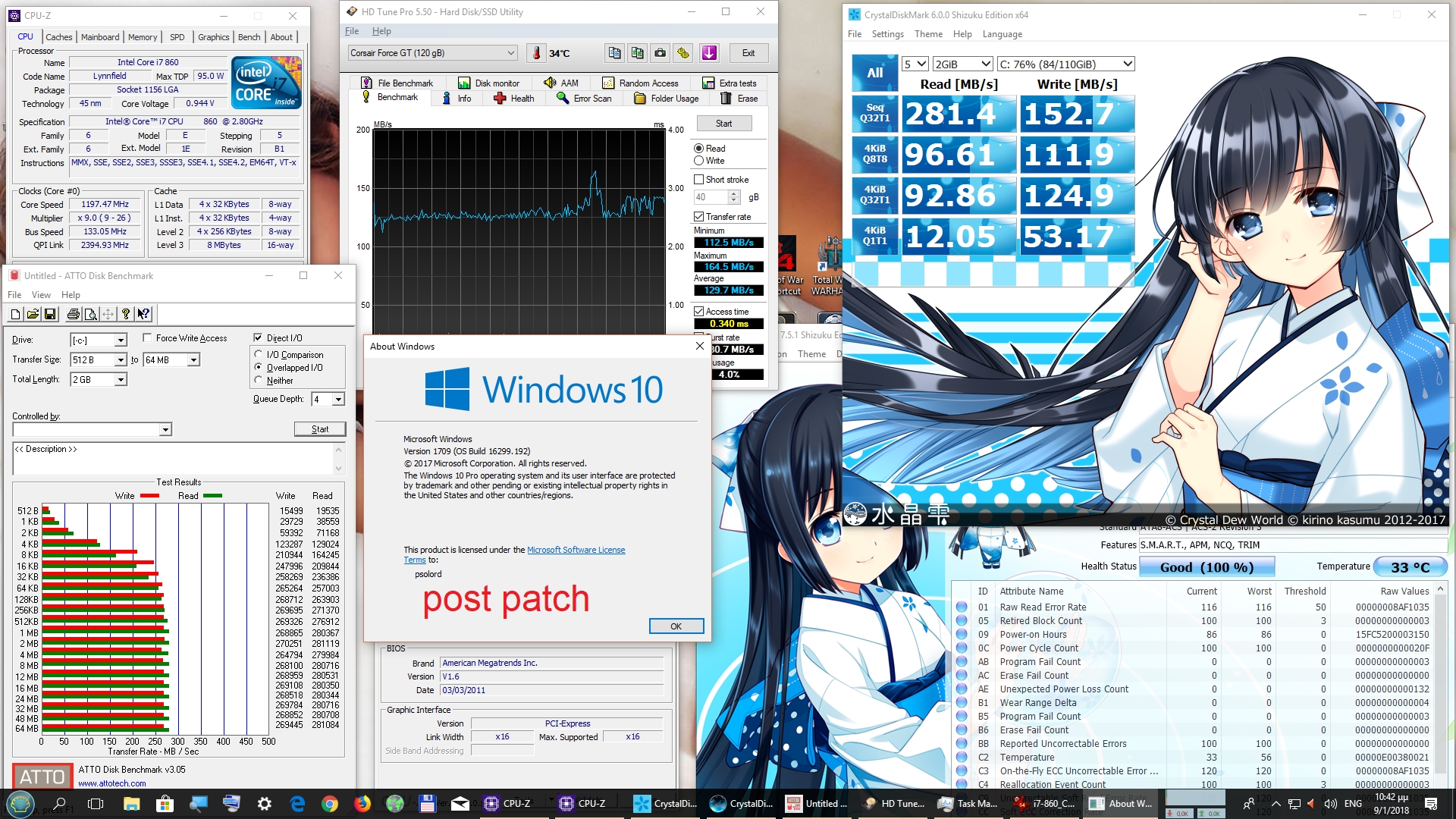 I have two SSDs. A Samsung 850 EVO 500GB and a Sandisk Extrepe Pro 240GB. Needless to say that the screeshots with the lower performance, are the ones of the patched system. I have the windows version captured on those.