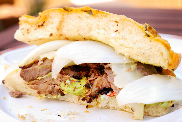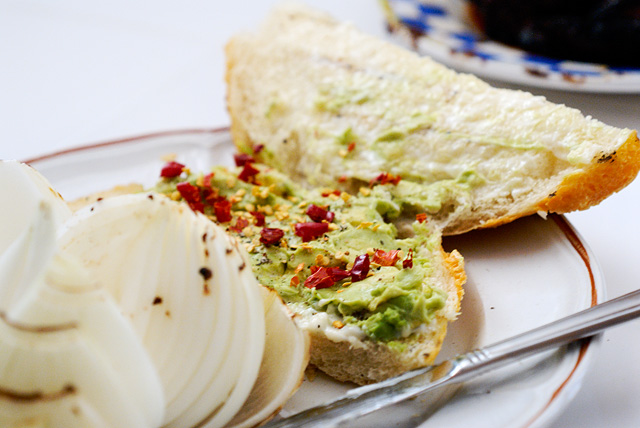 Assembly. Grilled onion + avocado + crushed red pepper + jalapeno cheddar focaccia.