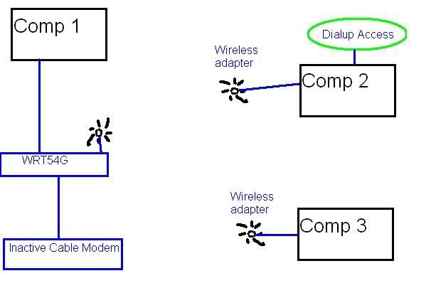 Hi i normally have cable internet but we had a big storm that knocked out our cable and they dont know how long it will take to get it back. We currently are using dialup until our cable is fixed. What I need to know is if its possible to share the dialup connection. Maybe using internet connection sharing or something? Here is what our setup looks like. The computer connected to the phone line for dialup connects to the router wirelessly and i dont know if this will be a problem. Thanks for any info!