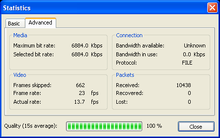 Huh? Every full-featured decoder I'm aware of has built-in statistics for bit-rate, frame rate, dropped frames, et. al. Here are the results for two of Microsoft's WMV-HD 720p clips using WMP11: http://s89934018.onlinehome.us...es/720p_wmv_corral.PNG http://s89934018.onlinehome.us...s/720p_wmv_fighter.PNG Both peg the CPU @ 90% ~ 100% utilization. Oddly, the second clip is much higher bit-rate but it plays smoothly with no dropped frames if I disable audio and don't touch the mouse (literally). I can't get the first clip (lower bit-rate) to play without dropping frames or 'glitching' no matter what, which is typical of most 720p HD clips I've played. 1080p is a slide-show. System Information Operating System: Windows XP Home Edition Service Pack 2 System Model: KT600-8237 Processor: AMD Athlon XP 2500+, MMX, 3DNow, 1.83GHz Memory: 1024MB RAM Card name: ATI MOBILITY RADEON 9600/9700 Series (AGP 8x) Display Memory: 128.0 MB Current Mode: 1024 x 768 (32 bit) (75Hz) Driver Version: Catalyst 7.4